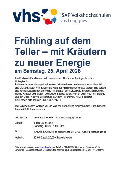 Wir kochen schnelle, vollwertige und leckere Rezepte mit saisonalen Kräutern und Zutaten für die ganze Familie. Auch lernen wir, welche Kräuter das Immunsystem stärken.